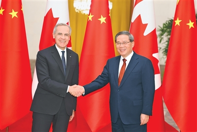 1月15日下午,国务院总理李强在北京人民大会堂同来华进行正式访问的加拿大总理卡尼举行会谈。新华社记者黄敬文摄新华社北京1月15日电 (记者董雪、陆君钰)国务院总理李强1月15日下午在北京人民大会堂同来华进行正式访